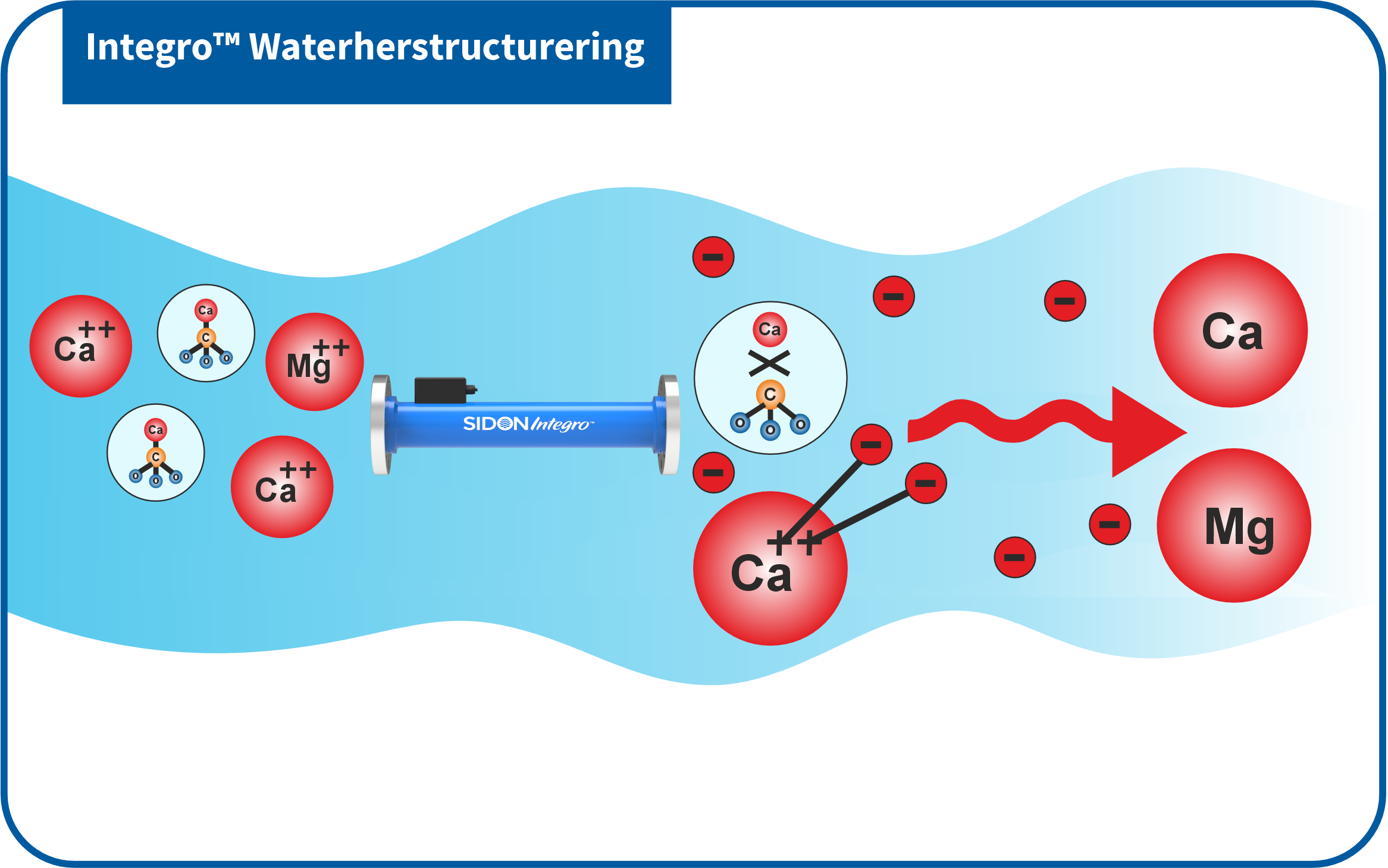 De Integro™ injecteert elektronen in het water, waardoor de natuurlijke binding tussen mineralen zoals calcium en magnesium wordt verstoord. Dit proces houdt de ionen in hun neutrale vorm, waardoor ze niet binden en kalkaanslag vormen.